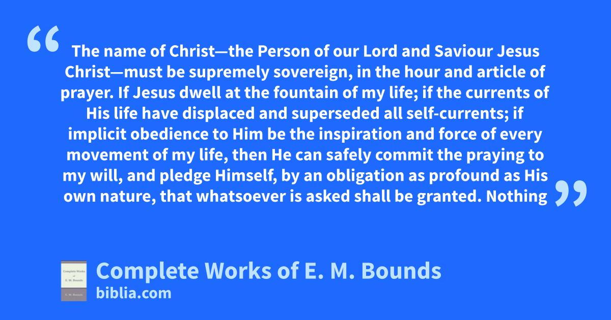 The name of Christ—the Person of our Lord and Saviour Jesus Christ—must be supremely sovereign, in the hour and article of prayer. If Jesus dwell at the fountain of my life; if the currents of His life have displaced and superseded all self-currents; if implicit obedience to Him be the inspiration and force of every movement of my life, then He can safely commit the praying to my will, and pledge Himself, by an obligation as profound as His own nature, that whatsoever is asked shall be granted. Nothing