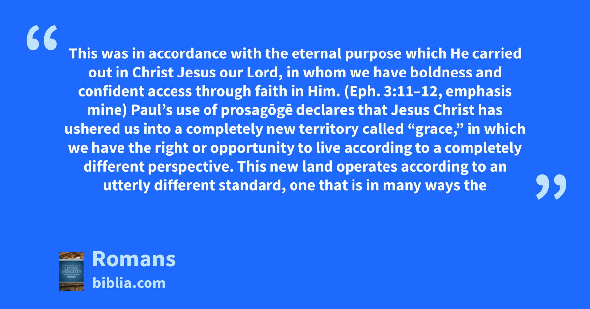This was in accordance with the eternal purpose which He carried out in Christ Jesus our Lord, in whom we have boldness and confident access through faith in Him. (Eph. 3:11–12, emphasis mine) Paul’s use of prosagōgē declares that Jesus Christ has ushered us into a completely new territory called “grace,” in which we have the right or opportunity to live according to a completely different perspective. This new land operates according to an utterly different standard, one that is in many ways the