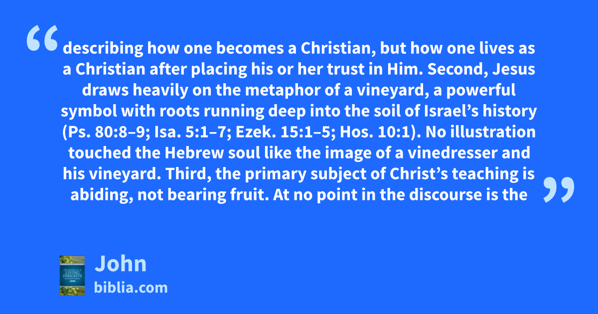 describing how one becomes a Christian, but how one lives as a Christian after placing his or her trust in Him. Second, Jesus draws heavily on the metaphor of a vineyard, a powerful symbol with roots running deep into the soil of Israel’s history (Ps. 80:8–9; Isa. 5:1–7; Ezek. 15:1–5; Hos. 10:1). No illustration touched the Hebrew soul like the image of a vinedresser and his vineyard. Third, the primary subject of Christ’s teaching is abiding, not bearing fruit. At no point in the discourse is the