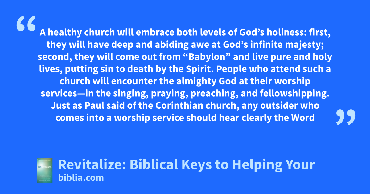 A healthy church will embrace both levels of God’s holiness: first, they will have deep and abiding awe at God’s infinite majesty; second, they will come out from “Babylon” and live pure and holy lives, putting sin to death by the Spirit. People who attend such a church will encounter the almighty God at their worship services—in the singing, praying, preaching, and fellowshipping. Just as Paul said of the Corinthian church, any outsider who comes into a worship service should hear clearly the Word