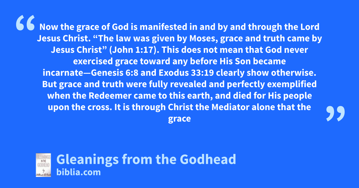 Now the grace of God is manifested in and by and through the Lord Jesus Christ. “The law was given by Moses, grace and truth came by Jesus Christ” (John 1:17). This does not mean that God never exercised grace toward any before His Son became incarnate—Genesis 6:8 and Exodus 33:19 clearly show otherwise. But grace and truth were fully revealed and perfectly exemplified when the Redeemer came to this earth, and died for His people upon the cross. It is through Christ the Mediator alone that the grace