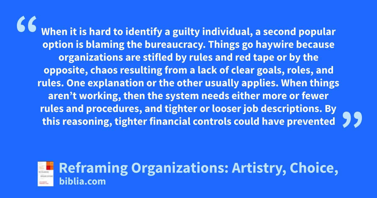 When it is hard to identify a guilty individual, a second popular option is blaming the bureaucracy. Things go haywire because organizations are stifled by rules and red tape or by the opposite, chaos resulting from a lack of clear goals, roles, and rules. One explanation or the other usually applies. When things aren’t working, then the system needs either more or fewer rules and procedures, and tighter or looser job descriptions. By this reasoning, tighter financial controls could have prevented