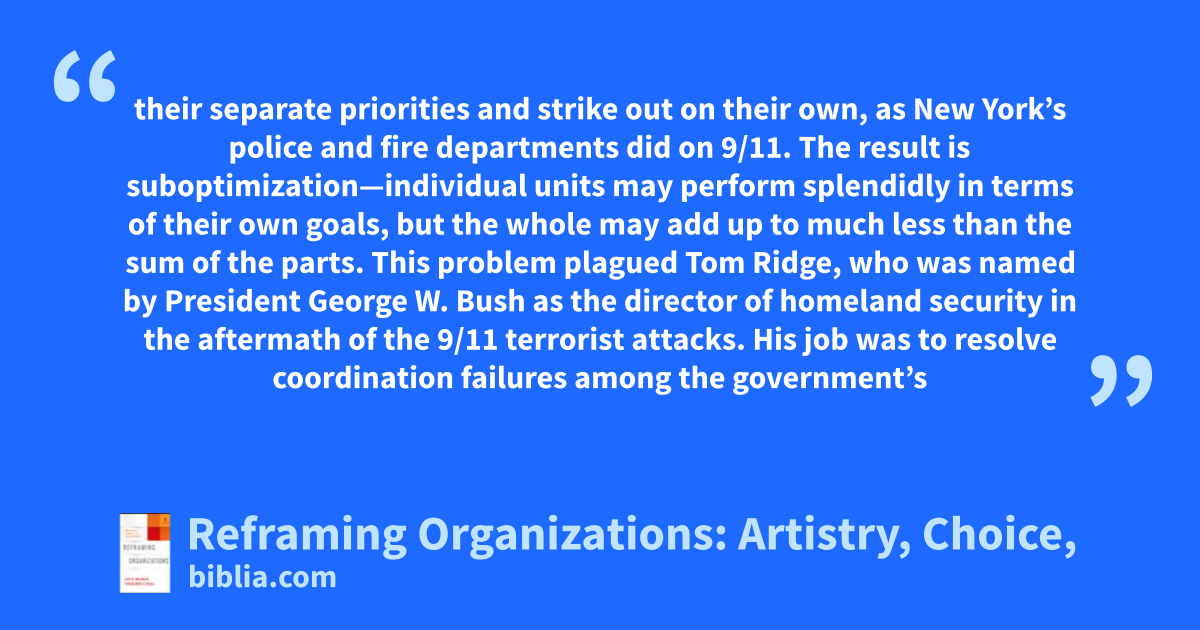 their separate priorities and strike out on their own, as New York’s police and fire departments did on 9/11. The result is suboptimization—individual units may perform splendidly in terms of their own goals, but the whole may add up to much less than the sum of the parts. This problem plagued Tom Ridge, who was named by President George W. Bush as the director of homeland security in the aftermath of the 9/11 terrorist attacks. His job was to resolve coordination failures among the government’s