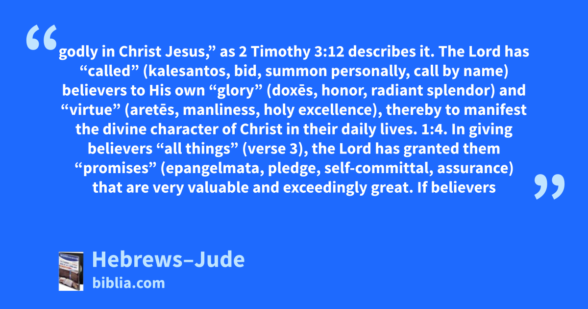 godly in Christ Jesus,” as 2 Timothy 3:12 describes it. The Lord has “called” (kalesantos, bid, summon personally, call by name) believers to His own “glory” (doxēs, honor, radiant splendor) and “virtue” (aretēs, manliness, holy excellence), thereby to manifest the divine character of Christ in their daily lives. 1:4. In giving believers “all things” (verse 3), the Lord has granted them “promises” (epangelmata, pledge, self-committal, assurance) that are very valuable and exceedingly great. If believers