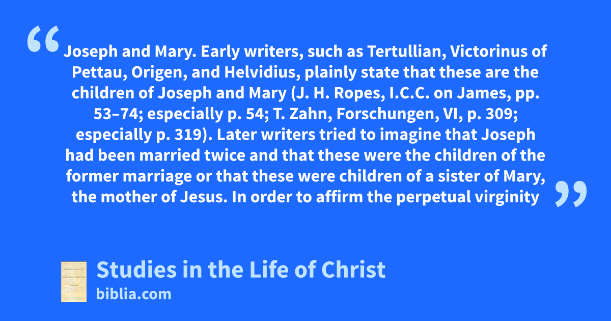 Joseph and Mary. Early writers, such as Tertullian, Victorinus of Pettau, Origen, and Helvidius, plainly state that these are the children of Joseph and Mary (J. H. Ropes, I.C.C. on James, pp. 53–74; especially p. 54; T. Zahn, Forschungen, VI, p. 309; especially p. 319). Later writers tried to imagine that Joseph had been married twice and that these were the children of the former marriage or that these were children of a sister of Mary, the mother of Jesus. In order to affirm the perpetual virginity
