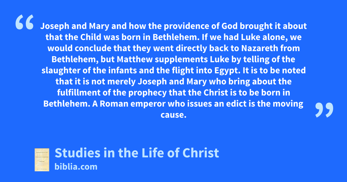 Joseph and Mary and how the providence of God brought it about that the Child was born in Bethlehem. If we had Luke alone, we would conclude that they went directly back to Nazareth from Bethlehem, but Matthew supplements Luke by telling of the slaughter of the infants and the flight into Egypt. It is to be noted that it is not merely Joseph and Mary who bring about the fulfillment of the prophecy that the Christ is to be born in Bethlehem. A Roman emperor who issues an edict is the moving cause.