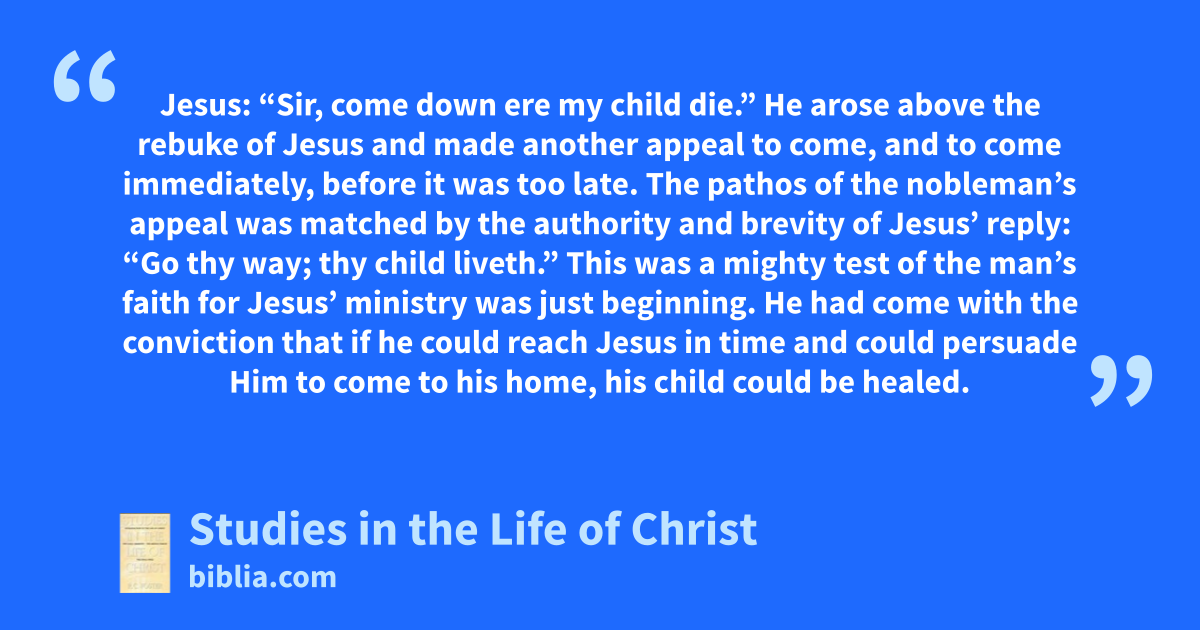 Jesus: “Sir, come down ere my child die.” He arose above the rebuke of Jesus and made another appeal to come, and to come immediately, before it was too late. The pathos of the nobleman’s appeal was matched by the authority and brevity of Jesus’ reply: “Go thy way; thy child liveth.” This was a mighty test of the man’s faith for Jesus’ ministry was just beginning. He had come with the conviction that if he could reach Jesus in time and could persuade Him to come to his home, his child could be healed.