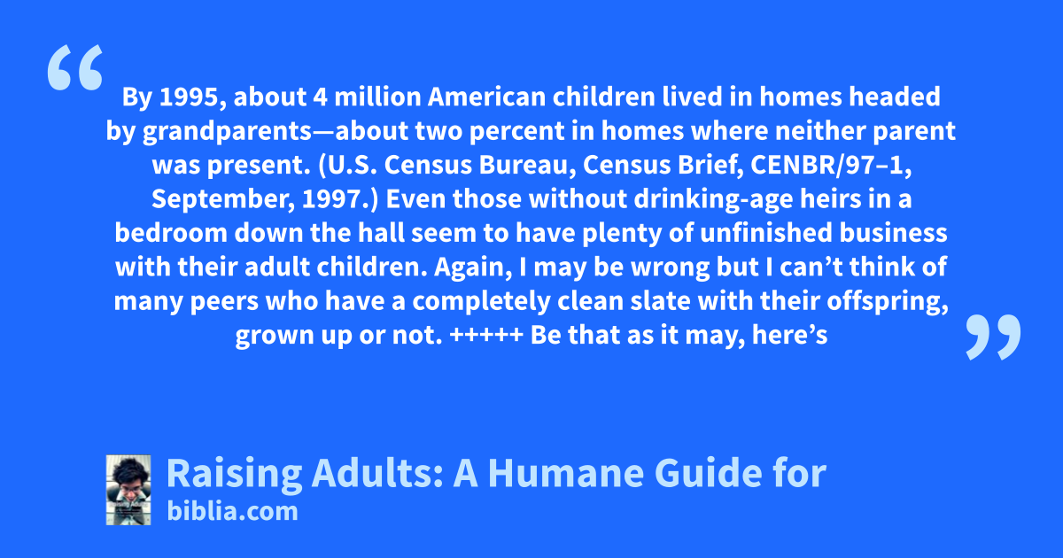 By 1995, about 4 million American children lived in homes headed by grandparents—about two percent in homes where neither parent was present. (U.S. Census Bureau, Census Brief, CENBR/97–1, September, 1997.) Even those without drinking-age heirs in a bedroom down the hall seem to have plenty of unfinished business with their adult children. Again, I may be wrong but I can’t think of many peers who have a completely clean slate with their offspring, grown up or not. +++++ Be that as it may, here’s