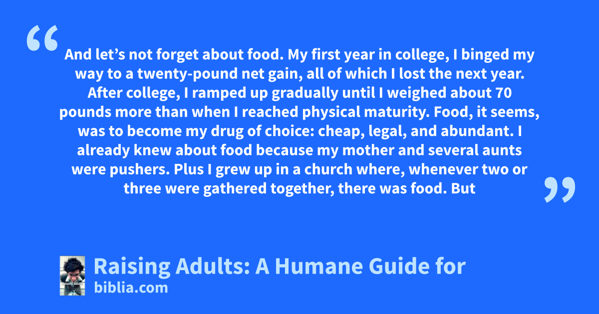 And let’s not forget about food. My first year in college, I binged my way to a twenty-pound net gain, all of which I lost the next year. After college, I ramped up gradually until I weighed about 70 pounds more than when I reached physical maturity. Food, it seems, was to become my drug of choice: cheap, legal, and abundant. I already knew about food because my mother and several aunts were pushers. Plus I grew up in a church where, whenever two or three were gathered together, there was food. But
