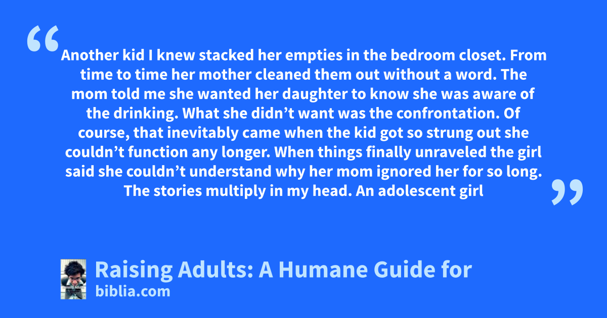 Another kid I knew stacked her empties in the bedroom closet. From time to time her mother cleaned them out without a word. The mom told me she wanted her daughter to know she was aware of the drinking. What she didn’t want was the confrontation. Of course, that inevitably came when the kid got so strung out she couldn’t function any longer. When things finally unraveled the girl said she couldn’t understand why her mom ignored her for so long. The stories multiply in my head. An adolescent girl