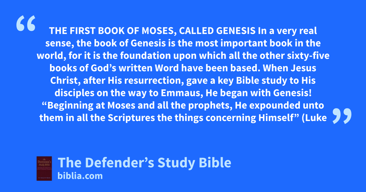 THE FIRST BOOK OF MOSES, CALLED GENESIS In a very real sense, the book of Genesis is the most important book in the world, for it is the foundation upon which all the other sixty-five books of God’s written Word have been based. When Jesus Christ, after His resurrection, gave a key Bible study to His disciples on the way to Emmaus, He began with Genesis! “Beginning at Moses and all the prophets, He expounded unto them in all the Scriptures the things concerning Himself” (Luke