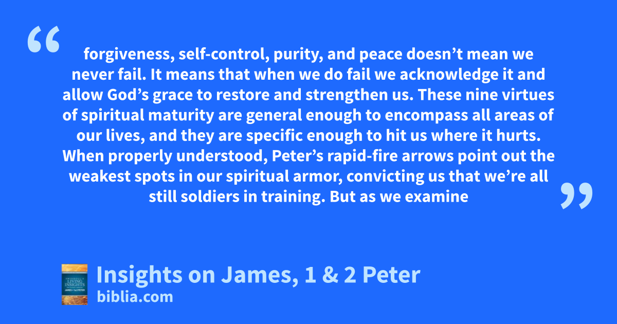 forgiveness, self-control, purity, and peace doesn’t mean we never fail. It means that when we do fail we acknowledge it and allow God’s grace to restore and strengthen us. These nine virtues of spiritual maturity are general enough to encompass all areas of our lives, and they are specific enough to hit us where it hurts. When properly understood, Peter’s rapid-fire arrows point out the weakest spots in our spiritual armor, convicting us that we’re all still soldiers in training. But as we examine