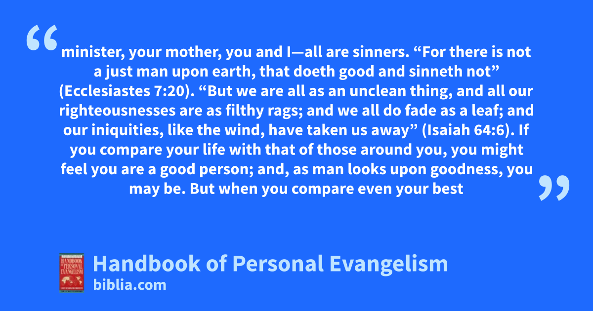 minister, your mother, you and I—all are sinners. “For there is not a just man upon earth, that doeth good and sinneth not” (Ecclesiastes 7:20). “But we are all as an unclean thing, and all our righteousnesses are as filthy rags; and we all do fade as a leaf; and our iniquities, like the wind, have taken us away” (Isaiah 64:6). If you compare your life with that of those around you, you might feel you are a good person; and, as man looks upon goodness, you may be. But when you compare even your best
