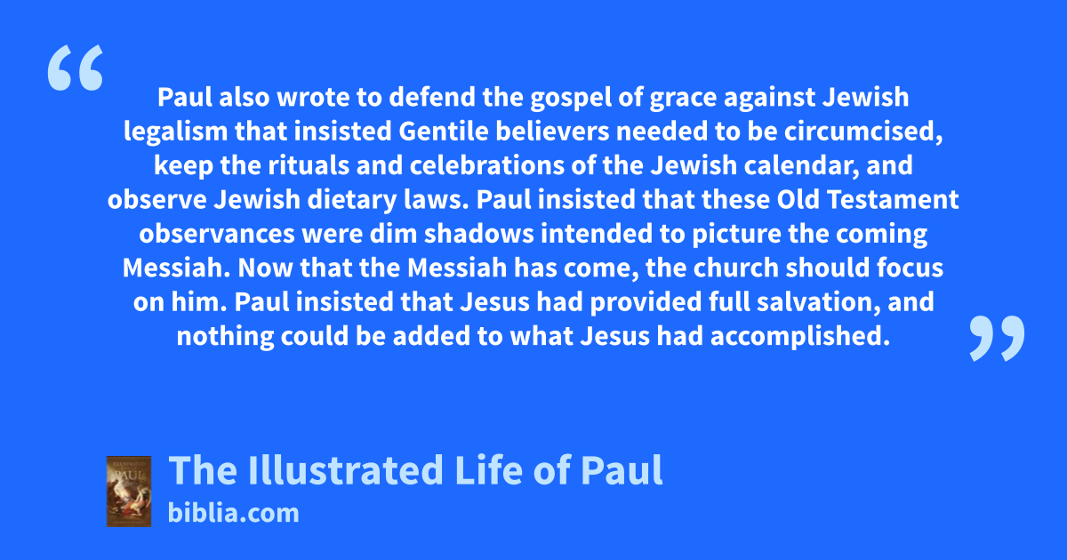 Paul also wrote to defend the gospel of grace against Jewish legalism that insisted Gentile believers needed to be circumcised, keep the rituals and celebrations of the Jewish calendar, and observe Jewish dietary laws. Paul insisted that these Old Testament observances were dim shadows intended to picture the coming Messiah. Now that the Messiah has come, the church should focus on him. Paul insisted that Jesus had provided full salvation, and nothing could be added to what Jesus had accomplished.