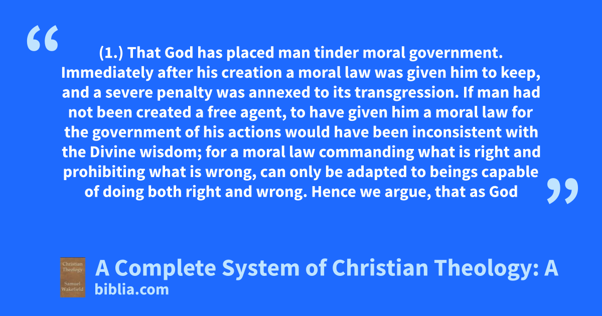 (1.) That God has placed man tinder moral government. Immediately after his creation a moral law was given him to keep, and a severe penalty was annexed to its transgression. If man had not been created a free agent, to have given him a moral law for the government of his actions would have been inconsistent with the Divine wisdom; for a moral law commanding what is right and prohibiting what is wrong, can only be adapted to beings capable of doing both right and wrong. Hence we argue, that as God