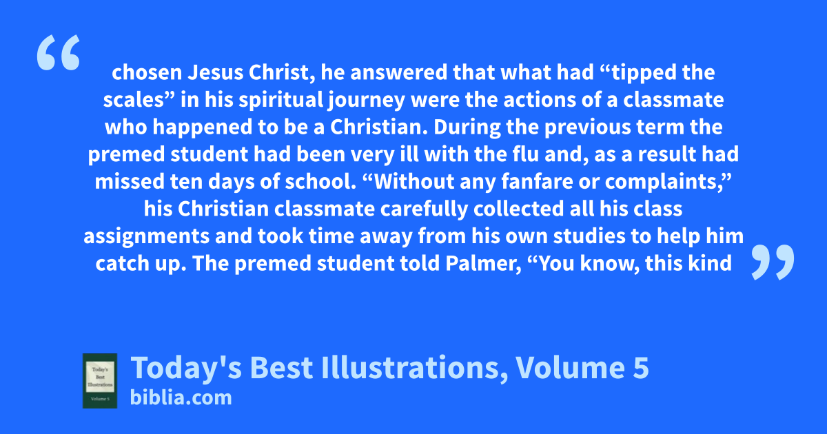 chosen Jesus Christ, he answered that what had “tipped the scales” in his spiritual journey were the actions of a classmate who happened to be a Christian. During the previous term the premed student had been very ill with the flu and, as a result had missed ten days of school. “Without any fanfare or complaints,” his Christian classmate carefully collected all his class assignments and took time away from his own studies to help him catch up. The premed student told Palmer, “You know, this kind