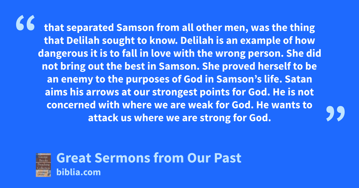 that separated Samson from all other men, was the thing that Delilah sought to know. Delilah is an example of how dangerous it is to fall in love with the wrong person. She did not bring out the best in Samson. She proved herself to be an enemy to the purposes of God in Samson’s life. Satan aims his arrows at our strongest points for God. He is not concerned with where we are weak for God. He wants to attack us where we are strong for God.