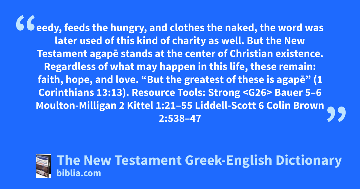 eedy, feeds the hungry, and clothes the naked, the word was later used of this kind of charity as well. But the New Testament agapē stands at the center of Christian existence. Regardless of what may happen in this life, these remain: faith, hope, and love. “But the greatest of these is agapē” (1 Corinthians 13:13). Resource Tools: Strong Bauer 5–6 Moulton-Milligan 2 Kittel 1:21–55 Liddell-Scott 6 Colin Brown 2:538–47
