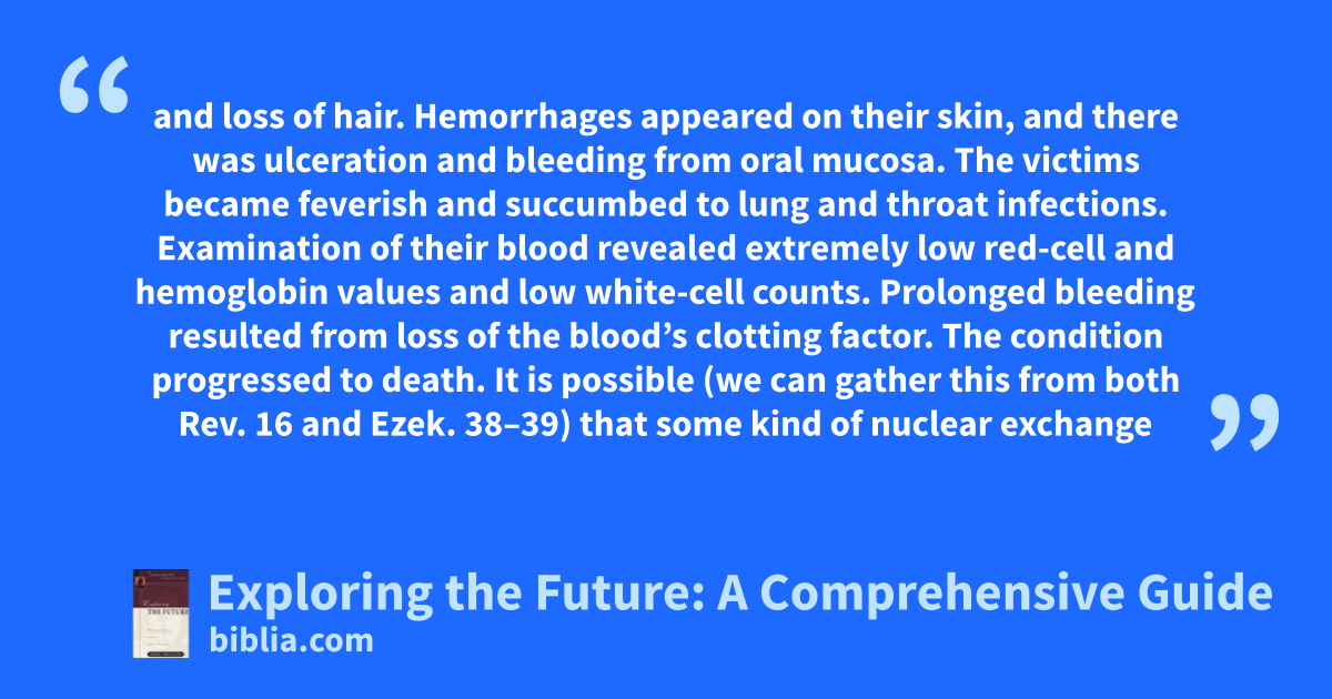 and loss of hair. Hemorrhages appeared on their skin, and there was ulceration and bleeding from oral mucosa. The victims became feverish and succumbed to lung and throat infections. Examination of their blood revealed extremely low red-cell and hemoglobin values and low white-cell counts. Prolonged bleeding resulted from loss of the blood’s clotting factor. The condition progressed to death. It is possible (we can gather this from both Rev. 16 and Ezek. 38–39) that some kind of nuclear exchange