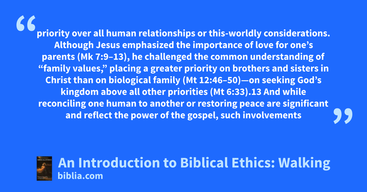 priority over all human relationships or this-worldly considerations. Although Jesus emphasized the importance of love for one’s parents (Mk 7:9–13), he challenged the common understanding of “family values,” placing a greater priority on brothers and sisters in Christ than on biological family (Mt 12:46–50)—on seeking God’s kingdom above all other priorities (Mt 6:33).13 And while reconciling one human to another or restoring peace are significant and reflect the power of the gospel, such involvements