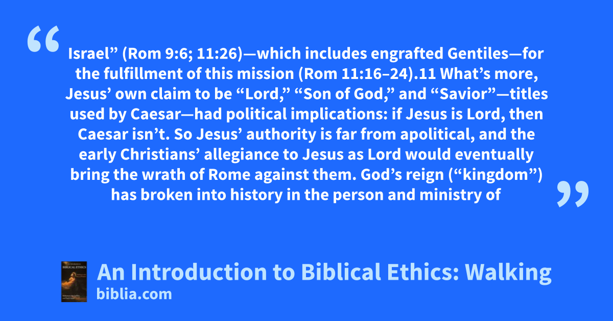 Israel” (Rom 9:6; 11:26)—which includes engrafted Gentiles—for the fulfillment of this mission (Rom 11:16–24).11 What’s more, Jesus’ own claim to be “Lord,” “Son of God,” and “Savior”—titles used by Caesar—had political implications: if Jesus is Lord, then Caesar isn’t. So Jesus’ authority is far from apolitical, and the early Christians’ allegiance to Jesus as Lord would eventually bring the wrath of Rome against them. God’s reign (“kingdom”) has broken into history in the person and ministry of