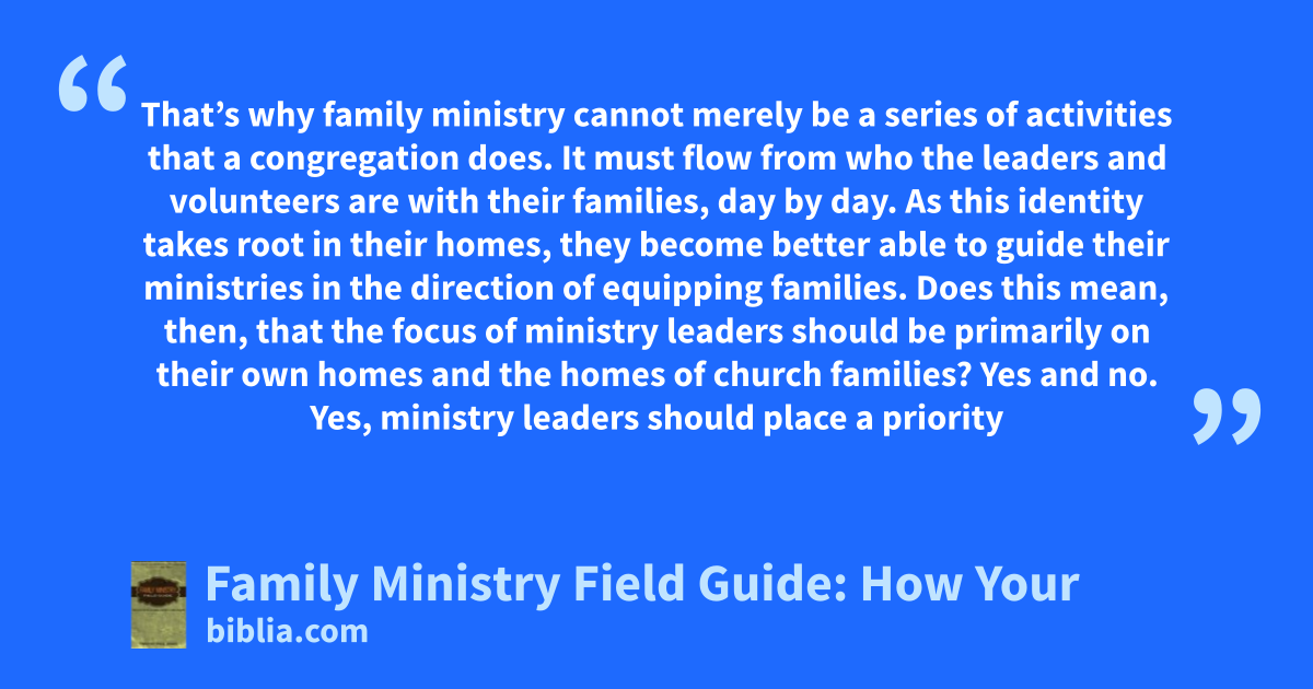 That’s why family ministry cannot merely be a series of activities that a congregation does. It must flow from who the leaders and volunteers are with their families, day by day. As this identity takes root in their homes, they become better able to guide their ministries in the direction of equipping families. Does this mean, then, that the focus of ministry leaders should be primarily on their own homes and the homes of church families? Yes and no. Yes, ministry leaders should place a priority