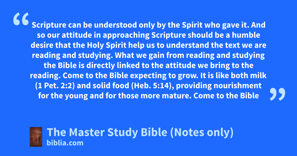 Scripture can be understood only by the Spirit who gave it. And so our attitude in approaching Scripture should be a humble desire that the Holy Spirit help us to understand the text we are reading and studying. What we gain from reading and studying the Bible is directly linked to the attitude we bring to the reading. Come to the Bible expecting to grow. It is like both milk (1 Pet. 2:2) and solid food (Heb. 5:14), providing nourishment for the young and for those more mature. Come to the Bible