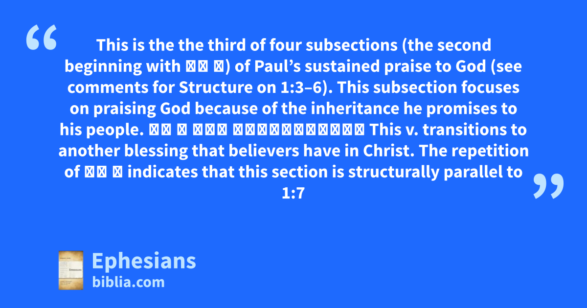 This is the the third of four subsections (the second beginning with ἐν ᾧ) of Paul’s sustained praise to God (see comments for Structure on 1:3–6). This subsection focuses on praising God because of the inheritance he promises to his people. ἐν ᾧ καὶ ἐκληρώθημεν This v. transitions to another blessing that believers have in Christ. The repetition of ἐν ᾧ indicates that this section is structurally parallel to 1:7