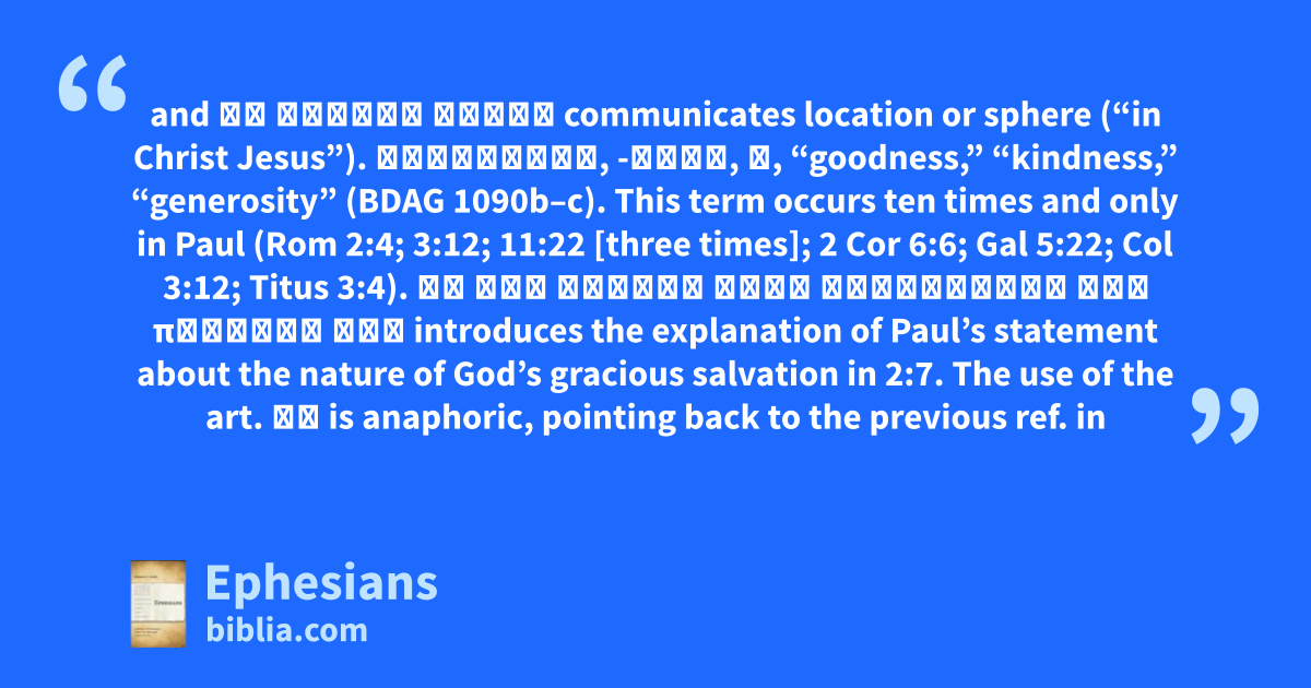 and ἐν Χριστῷ Ἰησοῦ communicates location or sphere (“in Christ Jesus”). Χρηστότης, -ητος, ἡ, “goodness,” “kindness,” “generosity” (BDAG 1090b–c). This term occurs ten times and only in Paul (Rom 2:4; 3:12; 11:22 [three times]; 2 Cor 6:6; Gal 5:22; Col 3:12; Titus 3:4). τῇ γὰρ χάριτί ἐστε σεσῳσμένοι διὰ πίστεως Γάρ introduces the explanation of Paul’s statement about the nature of God’s gracious salvation in 2:7. The use of the art. τῇ is anaphoric, pointing back to the previous ref. in