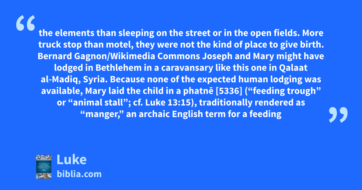 the elements than sleeping on the street or in the open fields. More truck stop than motel, they were not the kind of place to give birth. Bernard Gagnon/Wikimedia Commons Joseph and Mary might have lodged in Bethlehem in a caravansary like this one in Qalaat al-Madiq, Syria. Because none of the expected human lodging was available, Mary laid the child in a phatnē [5336] (“feeding trough” or “animal stall”; cf. Luke 13:15), traditionally rendered as “manger,” an archaic English term for a feeding