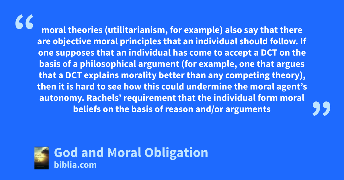 moral theories (utilitarianism, for example) also say that there are objective moral principles that an individual should follow. If one supposes that an individual has come to accept a DCT on the basis of a philosophical argument (for example, one that argues that a DCT explains morality better than any competing theory), then it is hard to see how this could undermine the moral agent’s autonomy. Rachels’ requirement that the individual form moral beliefs on the basis of reason and/or arguments