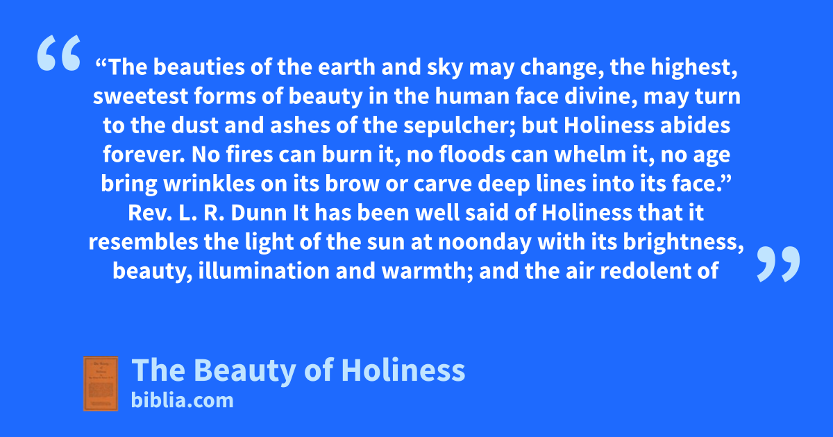 “The beauties of the earth and sky may change, the highest, sweetest forms of beauty in the human face divine, may turn to the dust and ashes of the sepulcher; but Holiness abides forever. No fires can burn it, no floods can whelm it, no age bring wrinkles on its brow or carve deep lines into its face.” Rev. L. R. Dunn It has been well said of Holiness that it resembles the light of the sun at noonday with its brightness, beauty, illumination and warmth; and the air redolent of