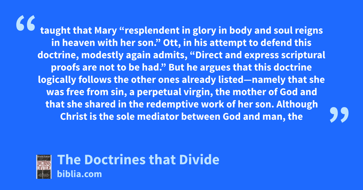 taught that Mary “resplendent in glory in body and soul reigns in heaven with her son.” Ott, in his attempt to defend this doctrine, modestly again admits, “Direct and express scriptural proofs are not to be had.” But he argues that this doctrine logically follows the other ones already listed—namely that she was free from sin, a perpetual virgin, the mother of God and that she shared in the redemptive work of her son. Although Christ is the sole mediator between God and man, the