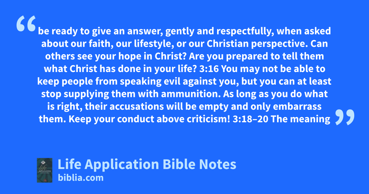 be ready to give an answer, gently and respectfully, when asked about our faith, our lifestyle, or our Christian perspective. Can others see your hope in Christ? Are you prepared to tell them what Christ has done in your life? 3:16 You may not be able to keep people from speaking evil against you, but you can at least stop supplying them with ammunition. As long as you do what is right, their accusations will be empty and only embarrass them. Keep your conduct above criticism! 3:18–20 The meaning