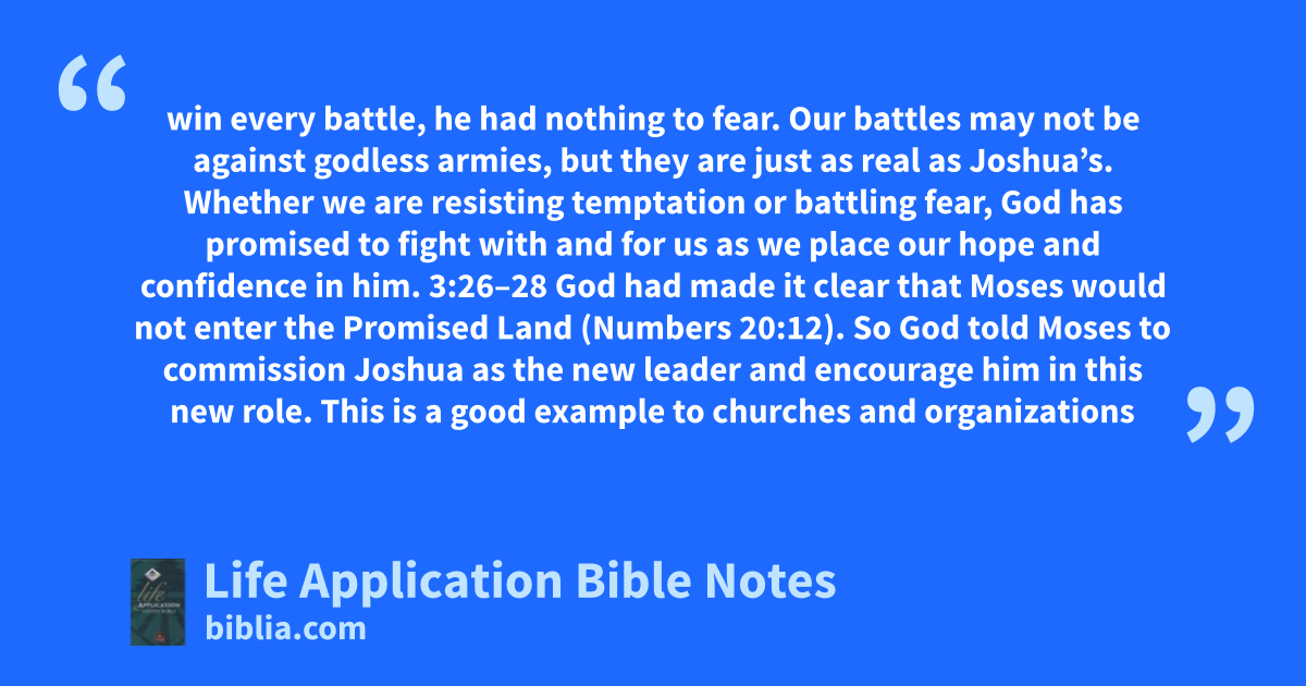 win every battle, he had nothing to fear. Our battles may not be against godless armies, but they are just as real as Joshua’s. Whether we are resisting temptation or battling fear, God has promised to fight with and for us as we place our hope and confidence in him. 3:26–28 God had made it clear that Moses would not enter the Promised Land (Numbers 20:12). So God told Moses to commission Joshua as the new leader and encourage him in this new role. This is a good example to churches and organizations