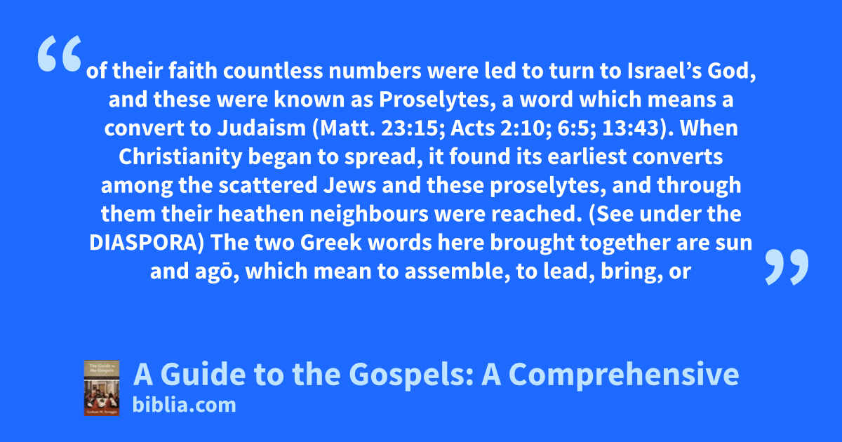 of their faith countless numbers were led to turn to Israel’s God, and these were known as Proselytes, a word which means a convert to Judaism (Matt. 23:15; Acts 2:10; 6:5; 13:43). When Christianity began to spread, it found its earliest converts among the scattered Jews and these proselytes, and through them their heathen neighbours were reached. (See under the DIASPORA) The two Greek words here brought together are sun and agō, which mean to assemble, to lead, bring, or