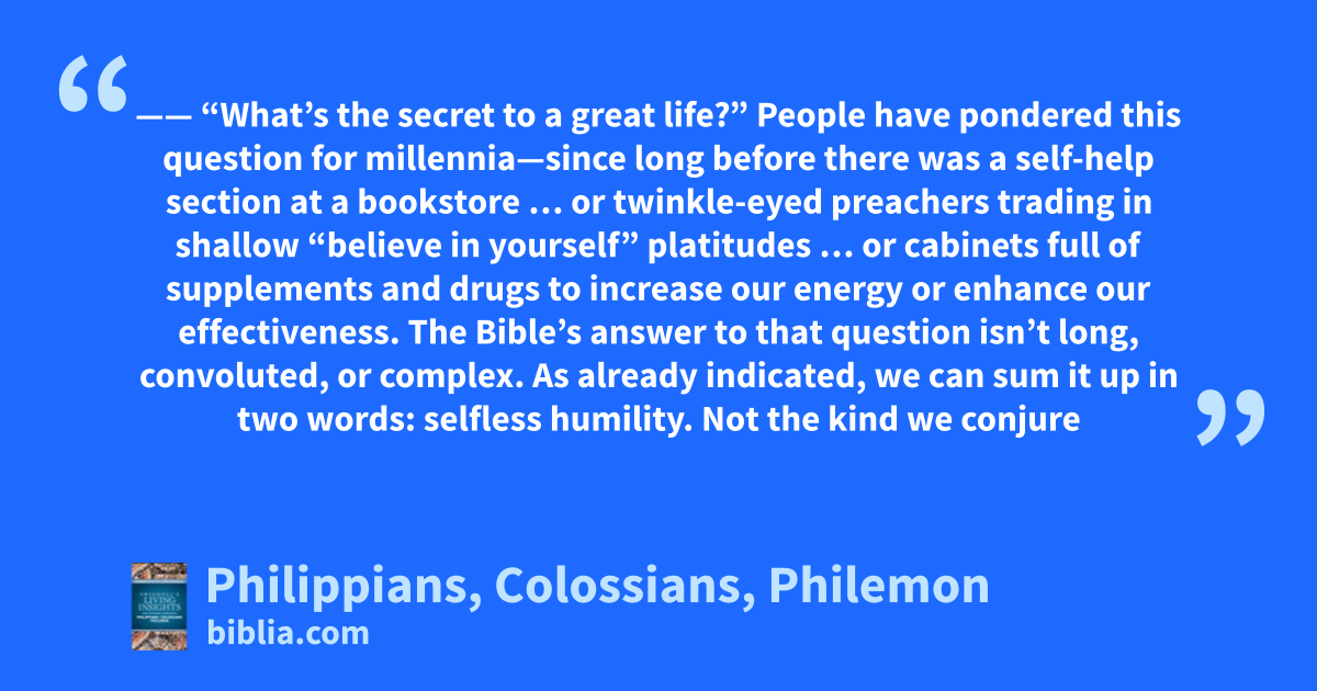 —— “What’s the secret to a great life?” People have pondered this question for millennia—since long before there was a self-help section at a bookstore … or twinkle-eyed preachers trading in shallow “believe in yourself” platitudes … or cabinets full of supplements and drugs to increase our energy or enhance our effectiveness. The Bible’s answer to that question isn’t long, convoluted, or complex. As already indicated, we can sum it up in two words: selfless humility. Not the kind we conjure