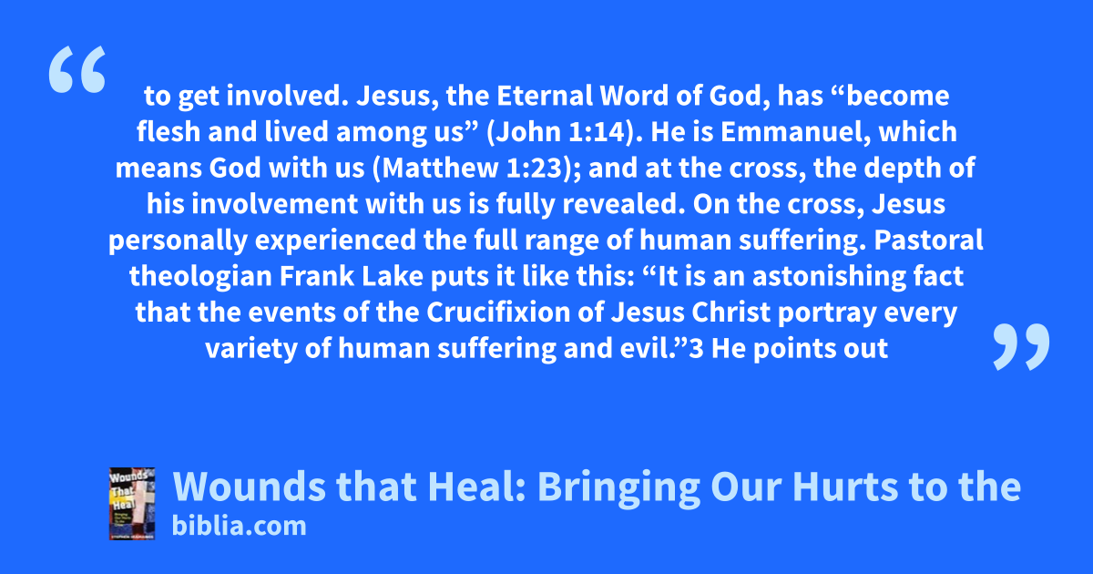 to get involved. Jesus, the Eternal Word of God, has “become flesh and lived among us” (John 1:14). He is Emmanuel, which means God with us (Matthew 1:23); and at the cross, the depth of his involvement with us is fully revealed. On the cross, Jesus personally experienced the full range of human suffering. Pastoral theologian Frank Lake puts it like this: “It is an astonishing fact that the events of the Crucifixion of Jesus Christ portray every variety of human suffering and evil.”3 He points out