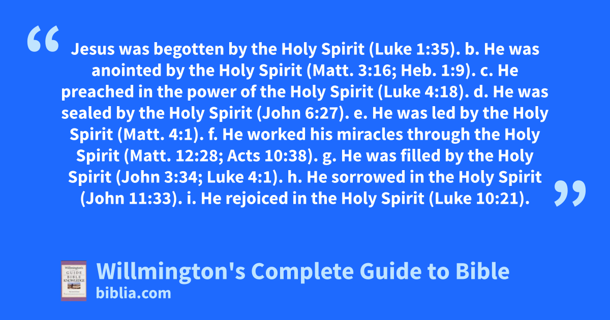 Jesus was begotten by the Holy Spirit (Luke 1:35). b. He was anointed by the Holy Spirit (Matt. 3:16; Heb. 1:9). c. He preached in the power of the Holy Spirit (Luke 4:18). d. He was sealed by the Holy Spirit (John 6:27). e. He was led by the Holy Spirit (Matt. 4:1). f. He worked his miracles through the Holy Spirit (Matt. 12:28; Acts 10:38). g. He was filled by the Holy Spirit (John 3:34; Luke 4:1). h. He sorrowed in the Holy Spirit (John 11:33). i. He rejoiced in the Holy Spirit (Luke 10:21).