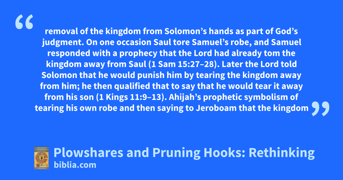 removal of the kingdom from Solomon’s hands as part of God’s judgment. On one occasion Saul tore Samuel’s robe, and Samuel responded with a prophecy that the Lord had already tom the kingdom away from Saul (1 Sam 15:27–28). Later the Lord told Solomon that he would punish him by tearing the kingdom away from him; he then qualified that to say that he would tear it away from his son (1 Kings 11:9–13). Ahijah’s prophetic symbolism of tearing his own robe and then saying to Jeroboam that the kingdom