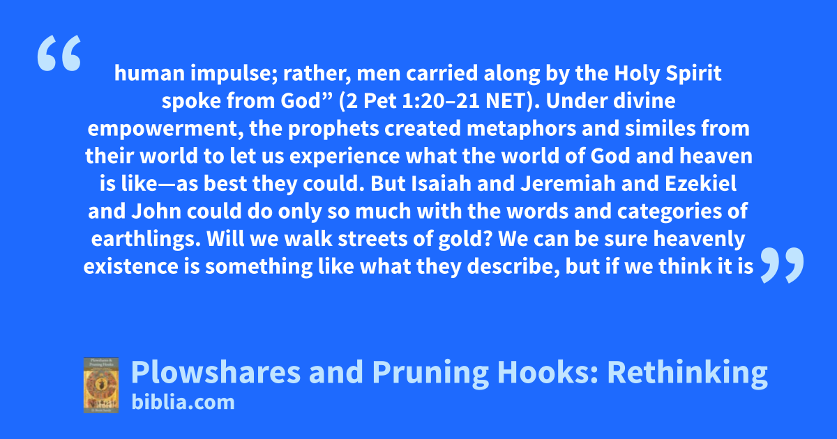 human impulse; rather, men carried along by the Holy Spirit spoke from God” (2 Pet 1:20–21 NET). Under divine empowerment, the prophets created metaphors and similes from their world to let us experience what the world of God and heaven is like—as best they could. But Isaiah and Jeremiah and Ezekiel and John could do only so much with the words and categories of earthlings. Will we walk streets of gold? We can be sure heavenly existence is something like what they describe, but if we think it is