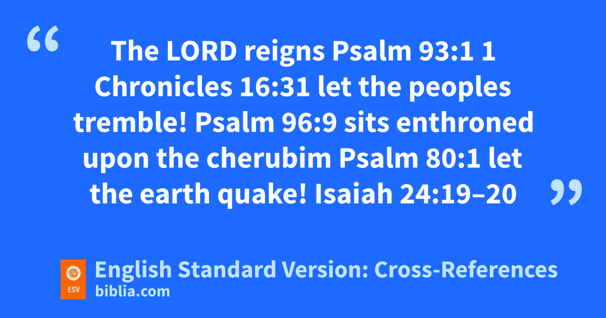 The LORD reigns Psalm 93:1 1 Chronicles 16:31 let the peoples tremble! Psalm 96:9 sits enthroned upon the cherubim Psalm 80:1 let the earth quake! Isaiah 24:19–20