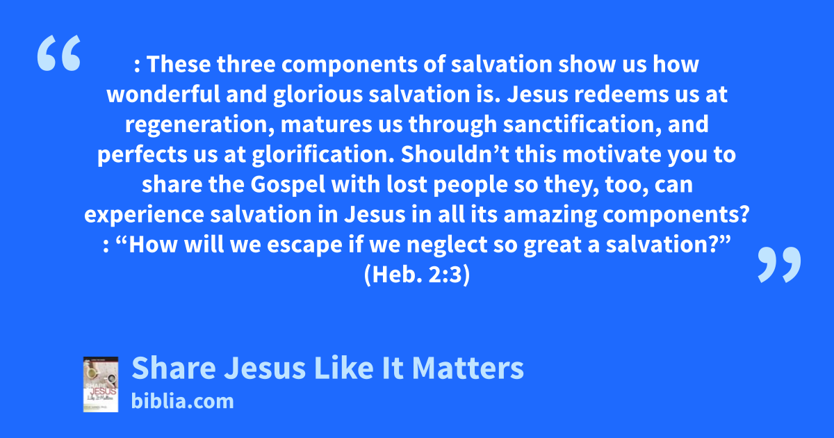 : These three components of salvation show us how wonderful and glorious salvation is. Jesus redeems us at regeneration, matures us through sanctification, and perfects us at glorification. Shouldn’t this motivate you to share the Gospel with lost people so they, too, can experience salvation in Jesus in all its amazing components? : “How will we escape if we neglect so great a salvation?” (Heb. 2:3)