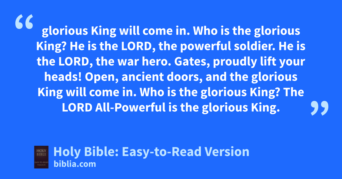 glorious King will come in. Who is the glorious King? He is the LORD, the powerful soldier. He is the LORD, the war hero. Gates, proudly lift your heads! Open, ancient doors, and the glorious King will come in. Who is the glorious King? The LORD All-Powerful is the glorious King.
