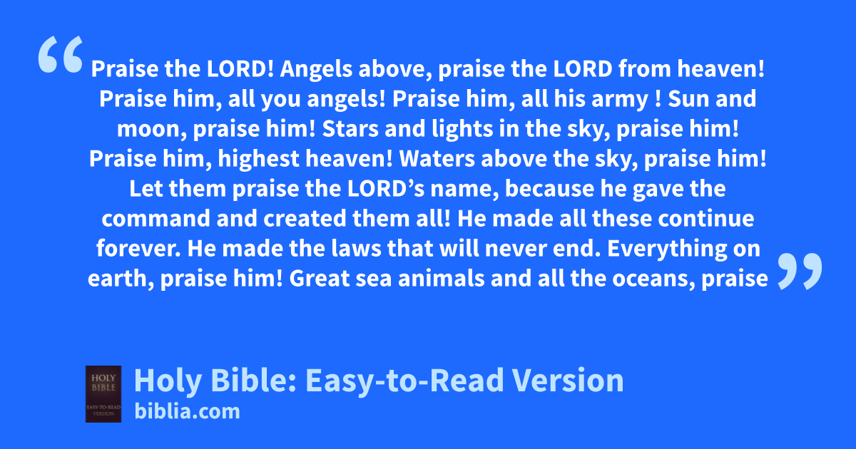Praise the LORD! Angels above, praise the LORD from heaven! Praise him, all you angels! Praise him, all his army ! Sun and moon, praise him! Stars and lights in the sky, praise him! Praise him, highest heaven! Waters above the sky, praise him! Let them praise the LORD’s name, because he gave the command and created them all! He made all these continue forever. He made the laws that will never end. Everything on earth, praise him! Great sea animals and all the oceans, praise