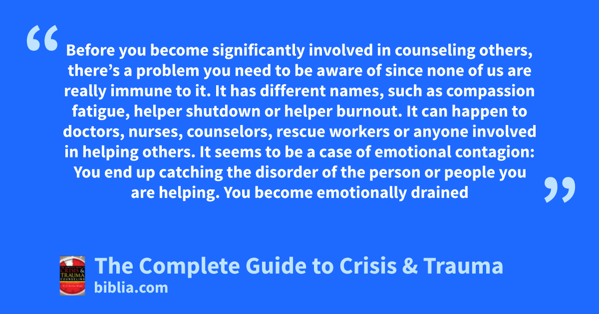 Before you become significantly involved in counseling others, there’s a problem you need to be aware of since none of us are really immune to it. It has different names, such as compassion fatigue, helper shutdown or helper burnout. It can happen to doctors, nurses, counselors, rescue workers or anyone involved in helping others. It seems to be a case of emotional contagion: You end up catching the disorder of the person or people you are helping. You become emotionally drained