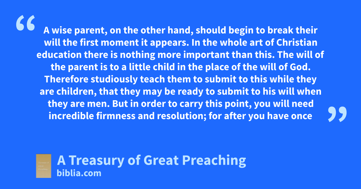 A wise parent, on the other hand, should begin to break their will the first moment it appears. In the whole art of Christian education there is nothing more important than this. The will of the parent is to a little child in the place of the will of God. Therefore studiously teach them to submit to this while they are children, that they may be ready to submit to his will when they are men. But in order to carry this point, you will need incredible firmness and resolution; for after you have once