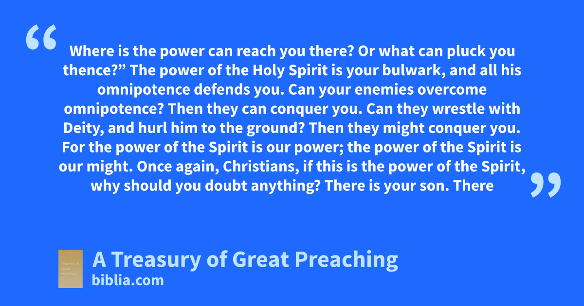 A Treasury of Great Preaching features some of the most influential preachers of the Christian Faith. It features John Calvin with 14 sermons, Jonathan Edwards with 17 sermons, Charles Finney with 106 sermons, Martin Luther with 79 sermons, Robert Murray McCheyne with 21 sermons, Dwight Lyman Moody with 16 sermons, George H. Morrison with 6 sermons, Billy Sunday with 2 sermons, Ruben Archer...
