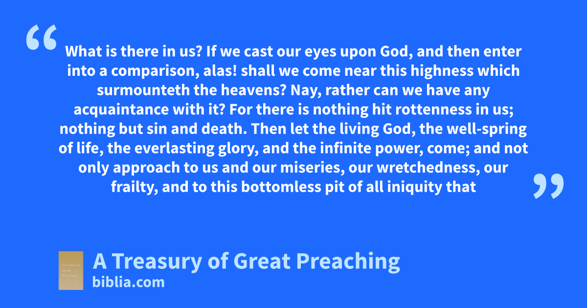 What is there in us? If we cast our eyes upon God, and then enter into a comparison, alas! shall we come near this highness which surmounteth the heavens? Nay, rather can we have any acquaintance with it? For there is nothing hit rottenness in us; nothing but sin and death. Then let the living God, the well-spring of life, the everlasting glory, and the infinite power, come; and not only approach to us and our miseries, our wretchedness, our frailty, and to this bottomless pit of all iniquity that