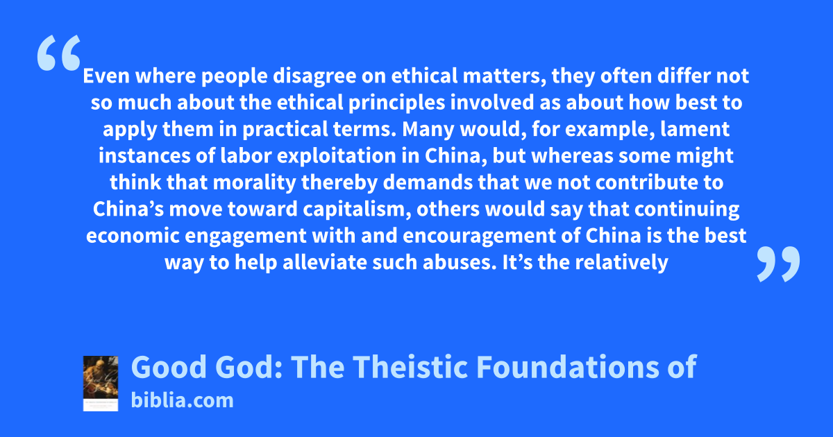 Even where people disagree on ethical matters, they often differ not so much about the ethical principles involved as about how best to apply them in practical terms. Many would, for example, lament instances of labor exploitation in China, but whereas some might think that morality thereby demands that we not contribute to China’s move toward capitalism, others would say that continuing economic engagement with and encouragement of China is the best way to help alleviate such abuses. It’s the relatively